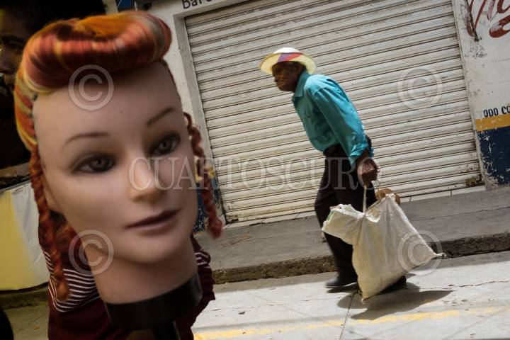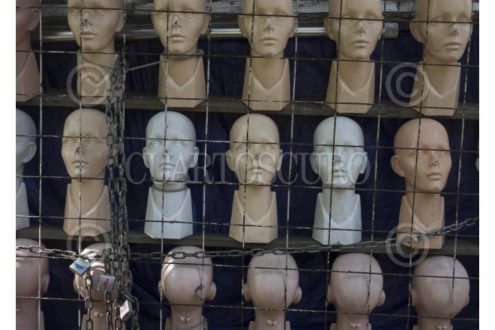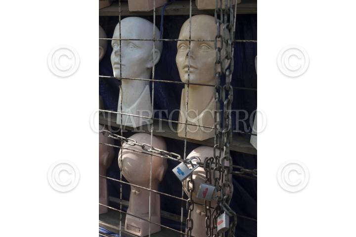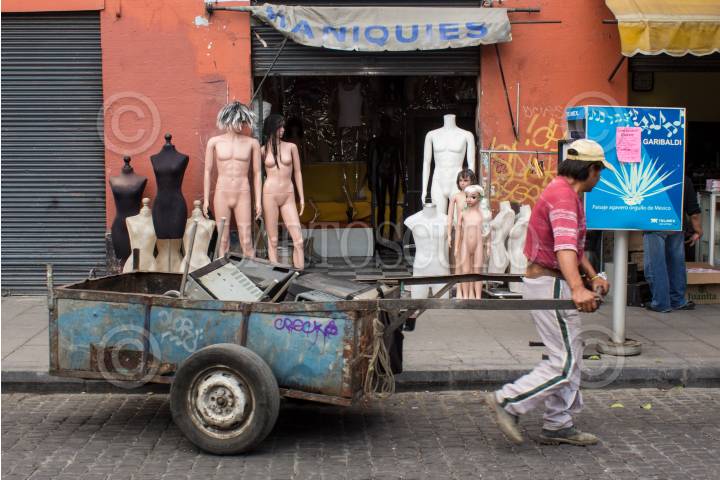 MEXICO, D.F., 18ABRIL2015.- Maniquies de una vieja tienda del centro de la ciudad, acosan, impertérritos, a los transeuntes que caminan por la acera. No obstante, la vida nunca se detiene en la megalopolis. FOTO: DAVID POLO /CUARTOSCURO.COM