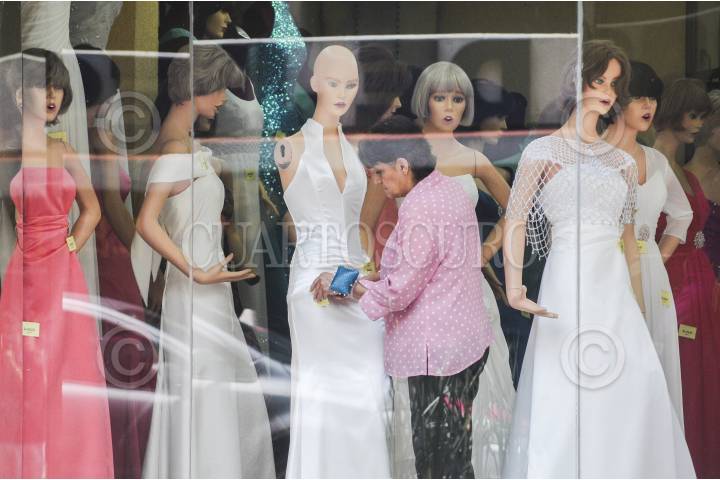 CIUDAD DE MÉXICO, 08OCTUBRE2016.- Una mujer viste a un maniquí dentro del escaparate de una tienda de vestidos sobre la calle 20 de noviembre en el centro histórico. FOTO: DIEGO SIMÓN SÁNCHEZ /CUARTOSCURO.COM