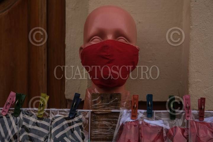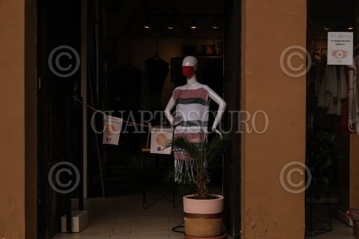Un maniquí en una de las tiendas de ropa de uno de los andadores principales de la ciudad porta un cubre bocas.