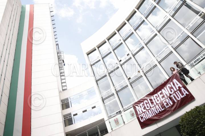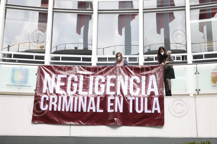 Las senadores panistas Xóchitl Gálvez y Kenia López Rabadán colocaron una manta con la leyenda "Negligencia criminal en Tula", en el Senado de la República.