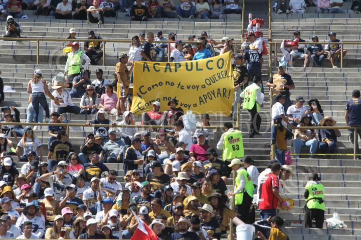 CIUDAD DE MÉXICO, 05NOVIEMBRE2023. Manta en apoyo a los damnificados de Acapulco durante el partido de fútbol Pumas vs Atlas correspondiente a la jornada 11 del Torneo Apertura 2023 de Liga BBVA MX, en el Estadio Olímpico Universitario. FOTO: EDGAR NEGRETE/CUARTOSCURO.COM