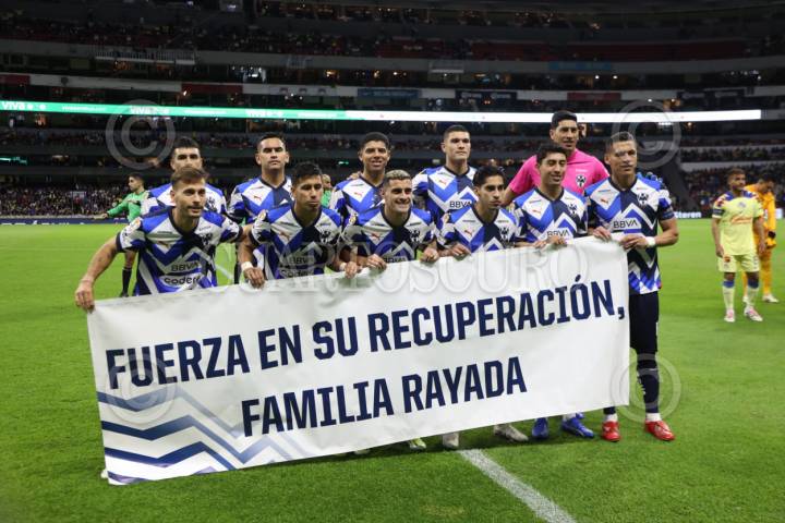 CIUDAD DE MÉXICO, 03FEBRERO2024. El equipo de Rayados exhibe una manta en apoyo a las familias afectadas por lo sucedido en Torreón, donde aficionados de Rayados fueron embestidos por una camioneta después del partido entre Santos y Monterrey. Partido de fútbol América vs Monterrey correspondiente a la jornada 5 del Torneo Clausura 2024 de Liga BBVA MX, en el Estadio Azteca. FOTO: EDGAR NEGRETE LIRA/CUARTOSCURO.COM
