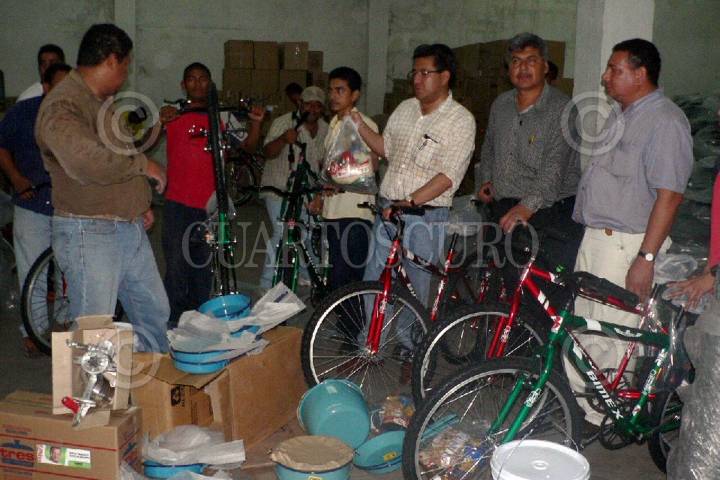COMALCALCO, TABASCO, 05OCTUBRE2006.- Por tercera vez consecutiva pero en esta ocación en centrica bodega, fueron encontradas miles de despensas, más de mil bicicletas y cientos de molinos, botes de pintura, rollos de mallas de alambres, sartenes y ollas. Se trata de uno de los más grandes golpes a los mapaches electorales que operan en todo el estado por parte del PRI dijeron diputados federales del PRD por el Estado al encontrar esta madrugada el mencionado lugar. FOTO: MARCO POLO GUZMÁN HERNÁNDEZ/CUARTOSCURO.COM