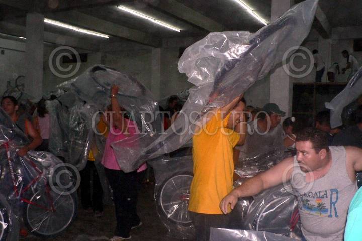 COMALCALCO, TABASCO, 05OCTUBRE2006.- Por tercera vez consecutiva pero en esta ocaciom en centrica bodega, fueron encontradas miles de despensas, más de mil bicicletas y cientos de molinos, botes de pintura, rollos de mallas de alambres, sartenes y ollas. Se trata de uno de los más grandes golpes a los mapaches electorales que operan en todo el estado por parte del PRI dijeron diputados federales del PRD por el Estado al encontrar esta madrugada el mencionado lugar. FOTO: MARCO POLO GUZMÁN HERNÁNDEZ/CUARTOSCURO.COM