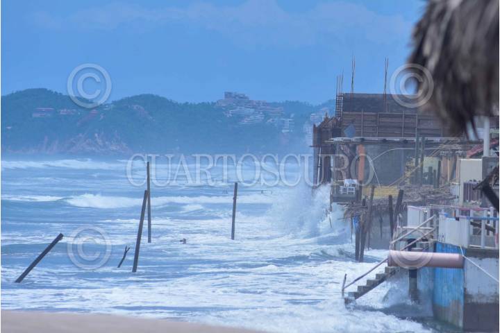 ACAPULCO, GUERRERO, 10JUNIO2025.- El fenómeno de mar de fondo continúa afectando las playas de la Zona Diamante de Acapulco. En la playa Bonfil, varios restaurantes han resultado dañados por el fuerte oleaje, y la franja de arena se ha reducido significativamente. El fenómeno comenzó después del paso de los huracanes Otis y John, y ha incrementado con el inicio de la temporada de lluvias, impactando las instalaciones en esta playa. FOTO: CARLOS ALBERTO CARBAJAL/CUARTOSCURO.COM