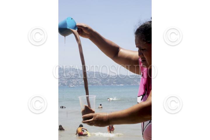 ACAPULCO, GUERRERO, 26JULIO2015.- Una mujer vendedora sirve el "chilate" en las playas de Acapulco. Esta bebida está elaboradada a base de cacao y arroz y se sirve bien fría para apaciguar el calor. FOTO: PATRICIA MORALES /CUARTOSCURO.COM