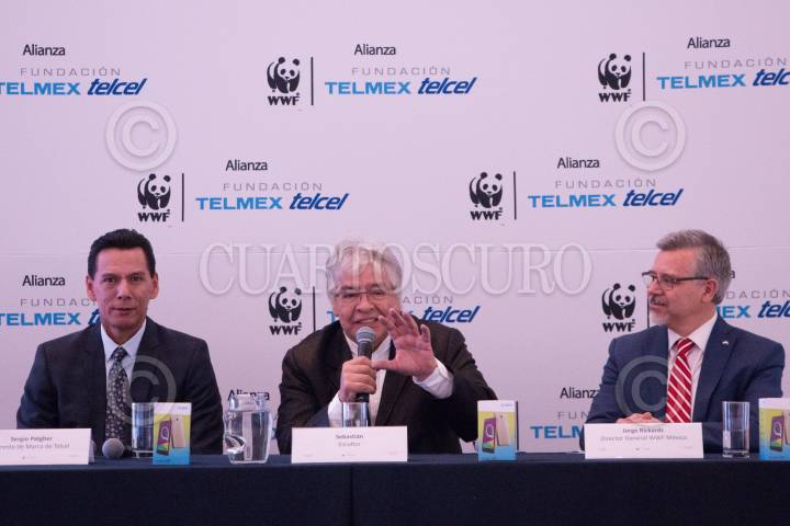 CIUDAD DE MÉXICO, 11FEBRERO2019.- Sergio Patgher, Gerente general de Telcel, Sebastian, escultor, premio nacional Bellas Artes y Jorge Ricksrds, gerente general de WWF México, momentos antes de cortar el listón de inauguración de la exposición, "Escúchame" en el museo Soumaya. FOTO: ROGELIO MORALES /CUARTOSCURO.COM