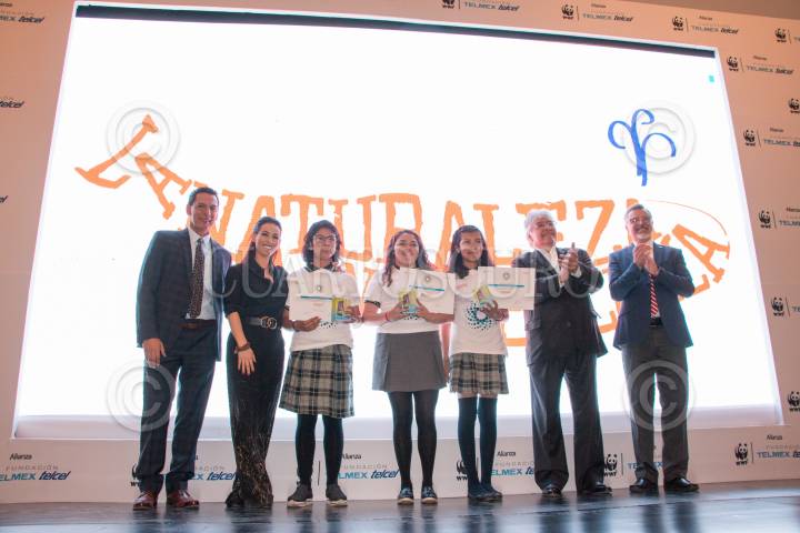 CIUDAD DE MÉXICO, 11FEBRERO2019.- Sergio Patgher, Gerente general de Telcel, Sebastian, escultor, premio nacional Bellas Artes y Jorge Ricksrds, gerente general de WWF México, con las ganadoras del primer lugar del concurso,"Escúchame" en donde participaron 16 mil estudiantes de secundaria y preparatoria, inspirados en la ballena jorobada, esta exposición se mantendrá del 12 al 24 de febrero en el museo Soumaya. FOTO: ROGELIO MORALES /CUARTOSCURO.COM