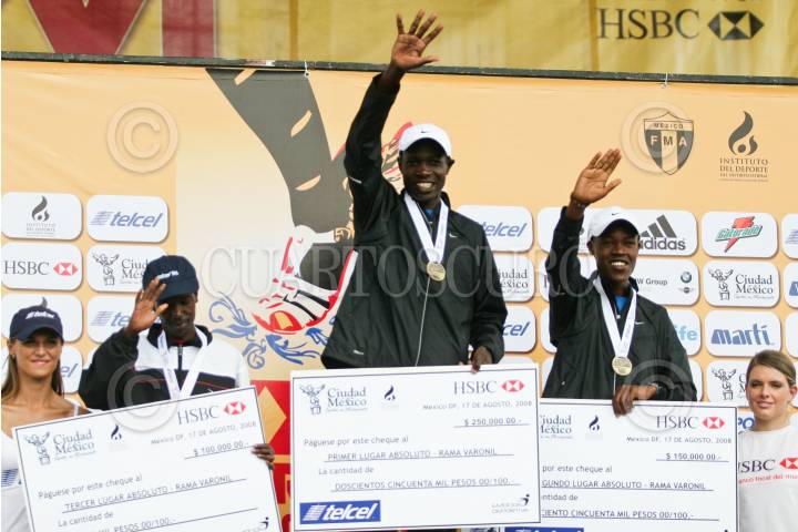 MÉXICO, D.F., 17AGOSTO2008.- Los corredores keniatas Hillary Kimaiyo, Julius Keter y Philip Metto, hicieron el 1-2-3 en la edición XXVI del Maratón Internacional de la Ciudad de México. FOTO: ISAAC ESQUIVEL/CUARTOSCURO.COM