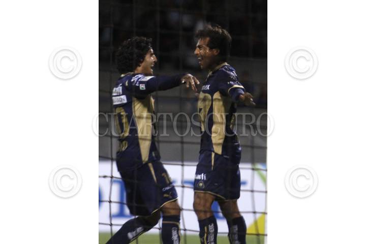 MÉXICO, D.F., 18MARZO2010.- Martín Bravo e Ismael Iñiguez (PUMAS) festejan una anotación del equipo en el partido donde los Pumas de la UNAM vencieron 5 goles a uno a CD Marathon de la Liga de Campeones de la CONCACAF disputado en el estadio de Ciudad Universitaria. FOTO: IVÁN STEPHENS/CUARTOSCURO.COM