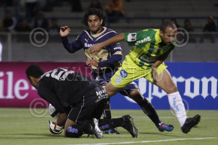 MÉXICO, D.F., 18MARZO2010.- Martín Bravo (PUMAS) disputó un balón con el portero Orlin Vallecillo (DC MARATHON) en el partido donde los Pumas de la UNAM vencieron 5 goles a uno a CD Marathon de la Liga de Campeones de la CONCACAF disputado en el estadio de Ciudad Universitaria. FOTO: IVÁN STEPHENS/CUARTOSCURO.COM