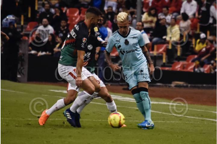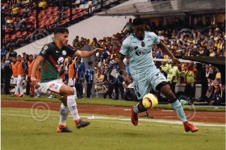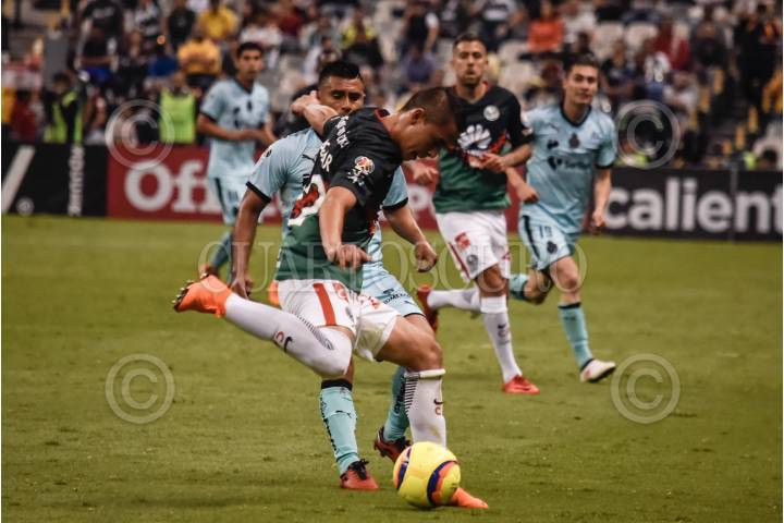 Jesús Molina Jugador de Chivas, disputa un balón ante el jugador contrario del América Pedro Aquino, esto durante el clásico nacional que se llevo a cabo en el Estadio Akron.