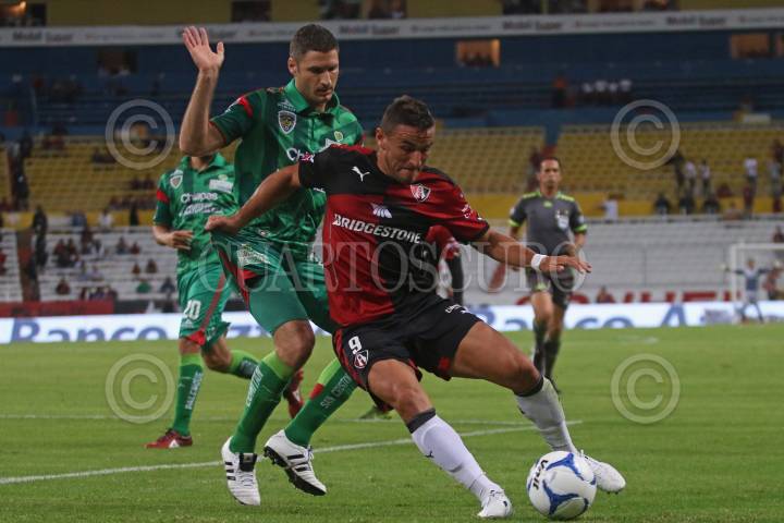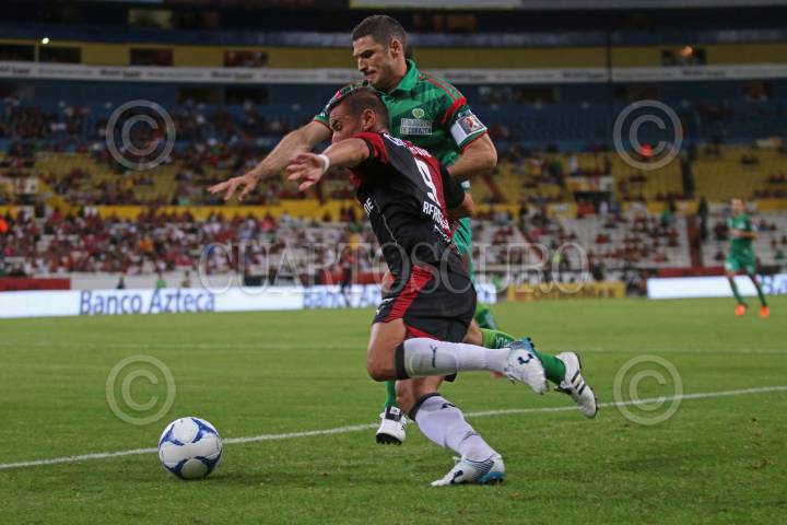 GUADALAJARA, JALISCO. 07NOVIEMBRE2015.- El jugador del Atlas Gonzalo Bergessio, disputa un balón frente al contrario de Jaguares Javier Muñoz Mustafa, esto en partido correspondiente a la Jornada 15 del Torneo Apertura 2015 de la Liga MX, en donde se enfrentan los equipos de los Zorros del Atlas frente a Jaguares de Chiapas, en partido que se juega en el Estadio Jalisco y en donde el marcador final fue 3-2 a favor del equipo visitante.