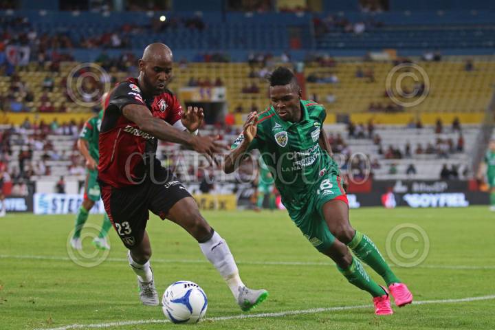 GUADALAJARA, JALISCO. 07NOVIEMBRE2015.- El jugador del Atlas Felipe Baloy, disputa un balón frente al contrario de Jaguares Avilés Hurtado, esto en partido correspondiente a la Jornada 15 del Torneo Apertura 2015 de la Liga MX, en donde se enfrentaron los equipos de los Zorros del Atlas frente a Jaguares de Chiapas, en partido que se juega en el Estadio Jalisco y en donde el marcador final fue 3-2 a favor del equipo visitante. FOTO: FERNANDO CARRANZA GARCIA / CUARTOSCURO.COM