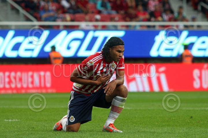 ZAPOPAN, JALISCO.10ENERO2016.- El jugador de Chivas, Carlos Peña se queja de un golpe durante el juego, esto en partido correspondiente a la Jornada 1 del Torneo Clausura 2016 de la Liga MX, en donde se enfrentan los equipos de las Chivas de Guadalajara frente a los Tiburones de Veracruz, en partido que se juega en el Estadio Omnilife. y en donde el marcador final fue de 2-2. FOTO: FERNANDO CARRANZA GARCIA / CUARTOSCURO.COM