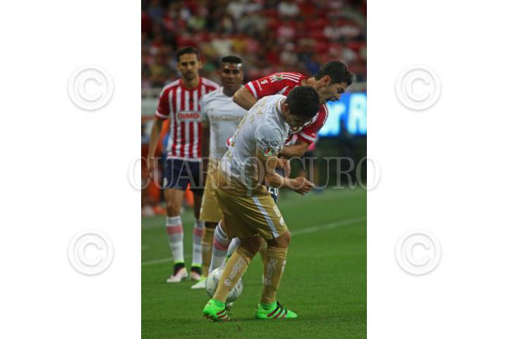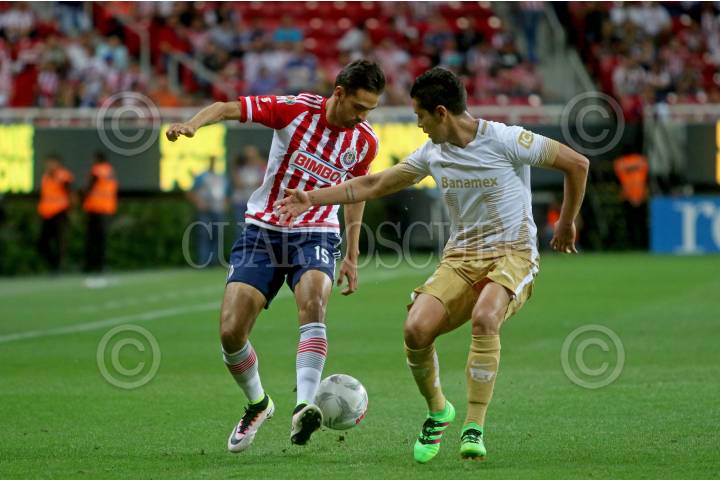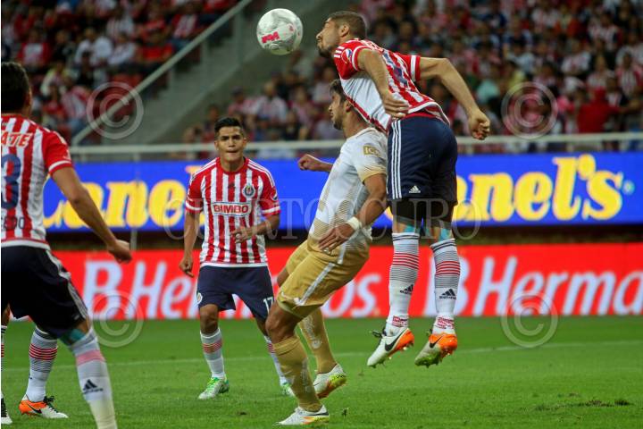 ZAPOPAN, JALISCO. 03ABRIL2016.- Raúl López jugador de Chivas disputa un balón a David Cabrera de Pumas en partido correspondiente a la Jornada 12 del Torneo Clausura 2016 de la Liga MX en donde se enfrentaron las Chivas de Guadalajara frente a los Pumas de la UNAM en encuentro que se llevo a cabo en el Estadio Chivas. El marcador al final del juego fue de 4-0 a favor de la Chivas. FOTO : FERNANDO CARRANZA GARCIA / CUARTOSCURO.COM