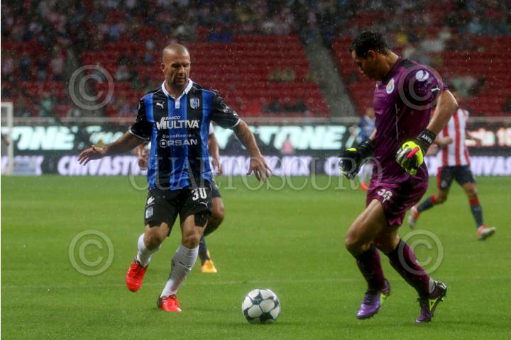ZAPOPAN, JALISCO. 06AGOSTO2016.- Emanuel Villa, jugador de Querétaro disputa un balón a Rodolfo Cota de Chivas en partido correspondiente a la Jornada 4 del Torneo Apertura 2016 de la Liga MX en donde se enfrentaron las Chivas de Guadalajara frente a los Gallos Blancos de Querétaro, en encuentro que se llevo a cabo en el Estadio Chivas. El marcador al final del juego fue de 0-0. FOTO : FERNANDO CARRANZA GARCIA / CUARTOSCURO.COM