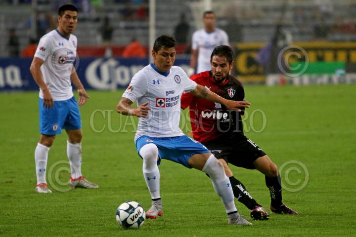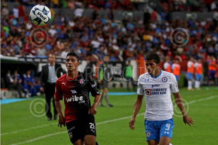 GUADALAJARA, JALISCO. 27AGOSTO2016.- Cándido Ramirez jugador de Atlas disputa un balón a Joao Rojas de Cruz Azul, en partido correspondiente a la Jornada 7 del Torneo Apertura 2016 de la Liga MX, en donde se enfrentan los Zorros del Atlas frente a la Maquina de Cruz Azul en encuentro que se lleva a cabo en el Estadio Jalisco, en donde el marcador final fue de 1-1. FOTO : FERNANDO CARRANZA GARCIA / CUARTOSCURO.COM