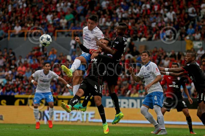 GUADALAJARA, JALISCO. 27AGOSTO2016.- Jugadores de Atlas y Cruz Azul se disputan un balón en el área del equipo local, en partido correspondiente a la Jornada 7 del Torneo Apertura 2016 de la Liga MX, en donde se enfrentan los Zorros del Atlas frente a la Maquina de Cruz Azul en encuentro que se lleva a cabo en el Estadio Jalisco, en donde el marcador final fue de 1-1. FOTO : FERNANDO CARRANZA GARCIA / CUARTOSCURO.COM
