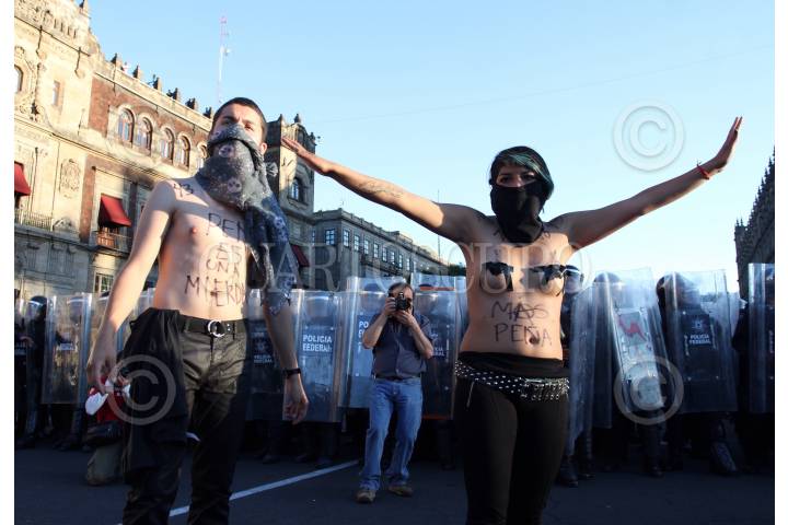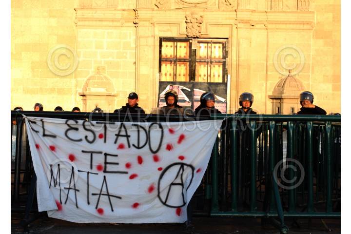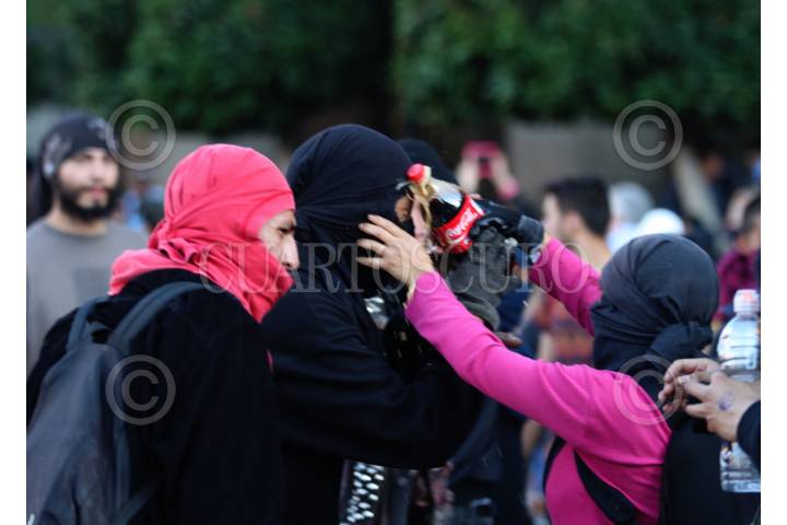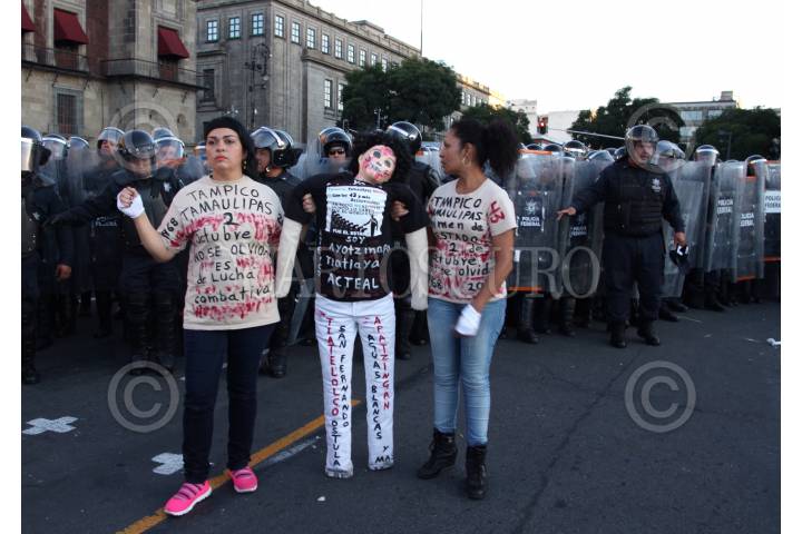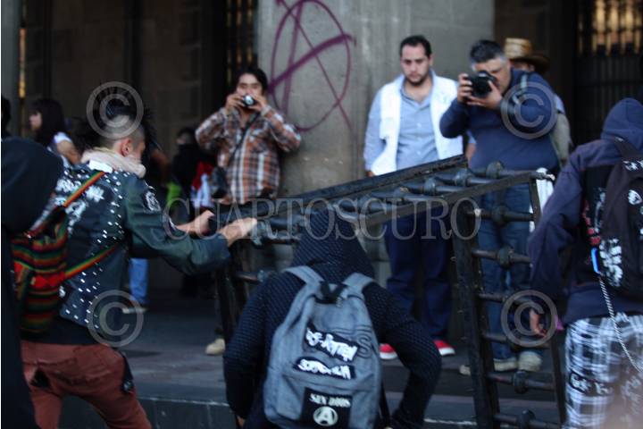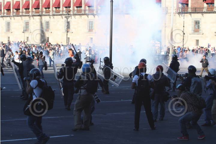 MÉXICO, D.F., 02OCTUBRE2015.- Grupos anarquistas se enfrentaron contra granaderos federales a un costado del contingente de la marcha por la conmemoración de la matanza de Tlatelolco de 1968. Granaderos utilizaron gas pimienta para replegarlos de la plancha del Zócalo. FOTO: MARÍA JOSÉ MARTÍNEZ /CUARTOSCURO.COM