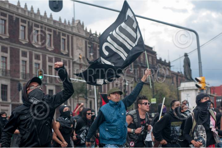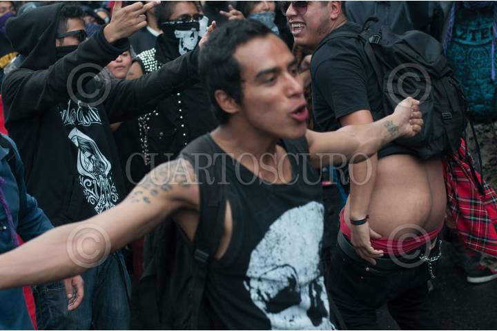 MÉXICO, D.F., 02OCTUBRE2014.- Jovenes autodenominados anarquitas durante la marcha para conmemorar la matanza de Tlatelolco que partió de la plaza de las tres culturas de Tlatelolco hasta el zócalo capitalino. FOTO: DIEGO SIMÓN SÁNCHEZ /CUARTOSCO.COM