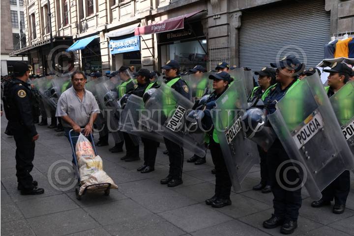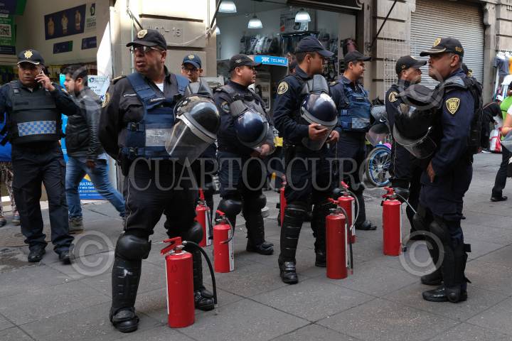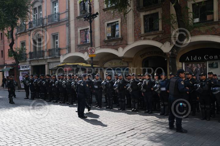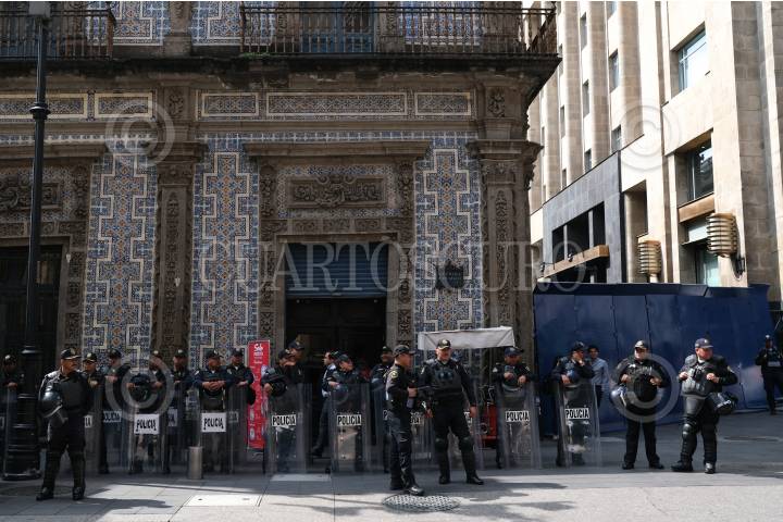 CIUDAD DE MÉXICO, 02OCTUBRE2019.- Elementos de la Policía se encuentran resguardando las calles del Centro Histórico, así mismo el Palacio de Bellas Artes, el Munal, el Mide y otros edificios se encuentran protegidos con láminas, debido a la Marcha en Conmemoración de la masacre del 2 de octubre del 68, la cual iniciará a las 4 de la tarde en la Plaza de las Tres Culturas, Tlatelolco y San Cosme con dirección al Zócalo capitalino. FOTO:GRACIELA LÓPEZ /CUARTOSCURO.COM