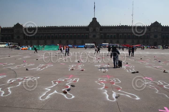 Colectivas realizaron pintas de siluetas de mujeres en la plancha de Zócalo
