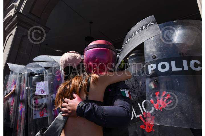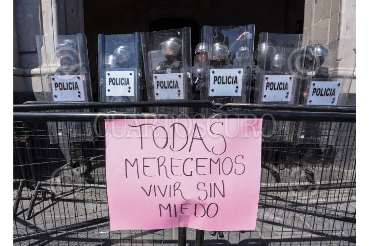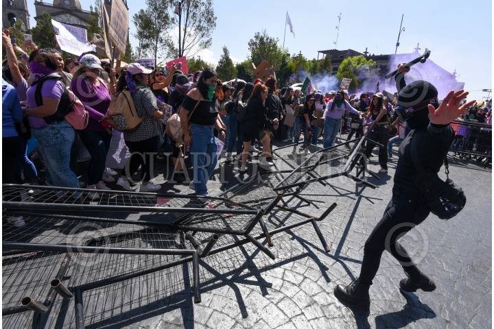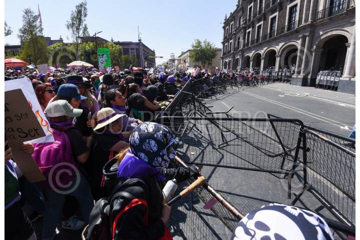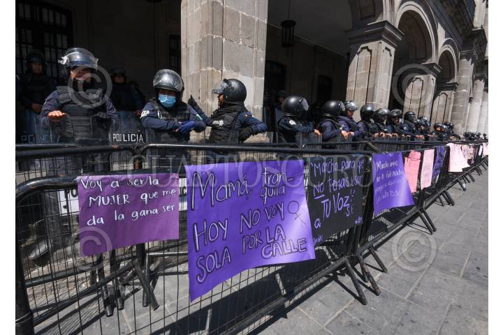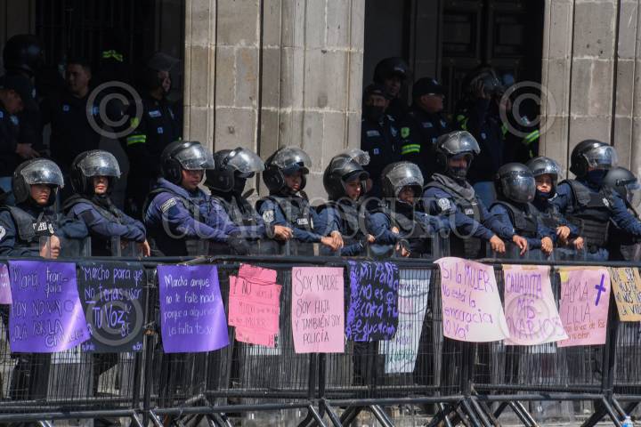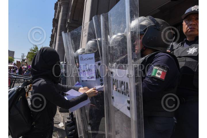 Mujeres policías durante la marcha del 8M en la ciudad de Toluca resguardaron edificios como Palacio de Gobierno.