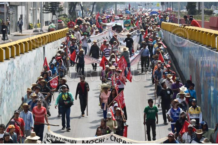 CIUDAD DE MÉXICO, 12ABRIL2016.- Campesinos de la CNPA, FICAM, CIOAC JDLD, UNIMOSS, FPFV y El Barzón, marcharon de la SEGOB hacia las instalaciones de la SHyCP ubicada en la avenida Constituyentes donde realizaron un mitin para dar a conocer sus demandas. Policías de la SSP resguardaron la marcha con personal antimotines y transito. FOTO: ARMANDO MONROY /CUARTOSCURO.COM