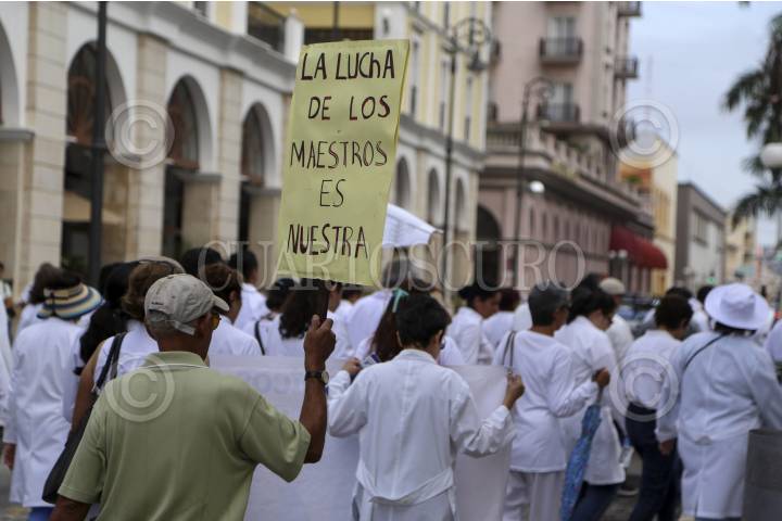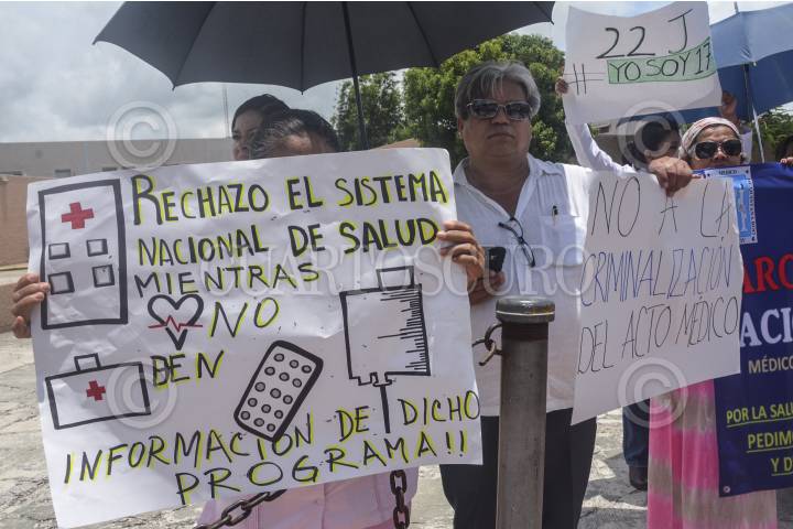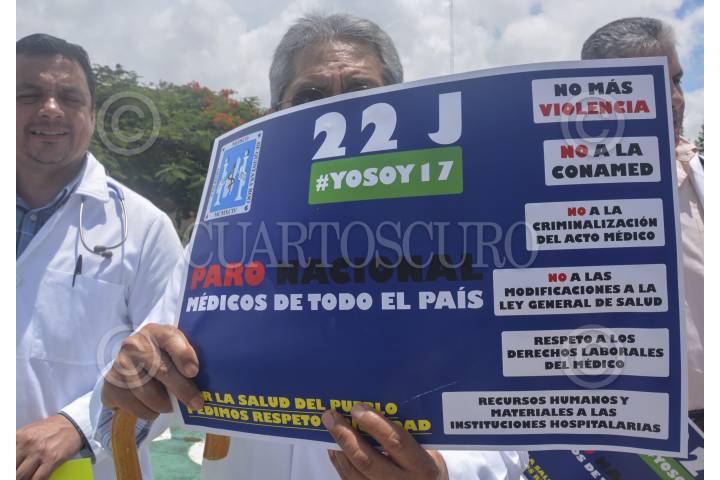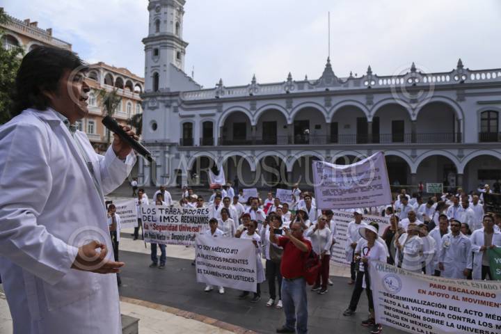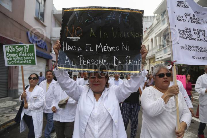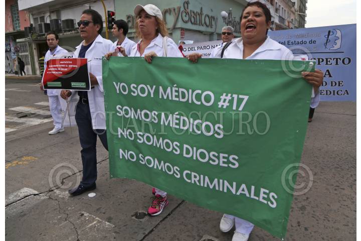 VERACRUZ, VERACRUZ, 22JUNIO16.- Médicos de la zona conurbada marcharon para exigir un alto a la criminalización de su profesión. Manifestaron también su absoluto rechazo a la privatización de los servicios de salud mediante el nuevo sistema universal; estas protestas se unen al paro escalonado en apoyo al movimiento nacional #yosoy17 que inició el año anterior. FOTO: ILSE HUESCA /CUARTOSCURO.COM