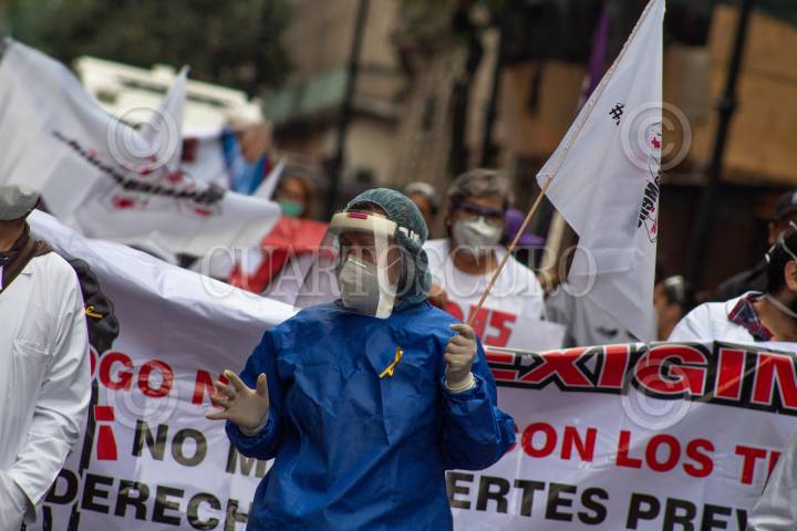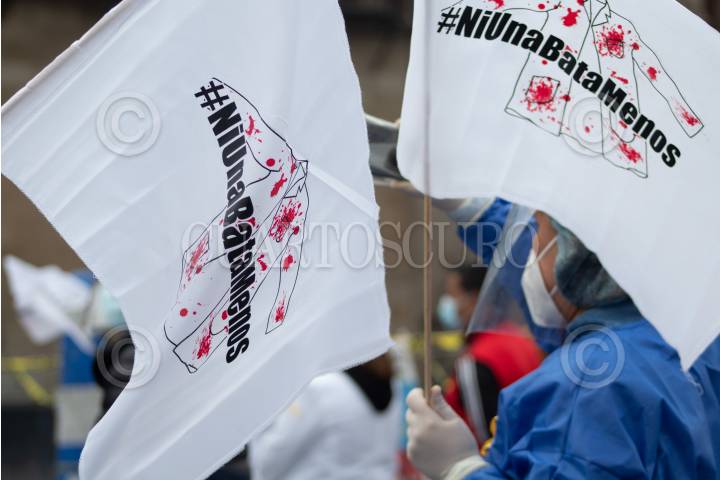 "Ni héroes ni asesinos, somos: Médicos", mensaje que se puede leer en una de las pancartas que sostiene personal de salud durante la manifestación.