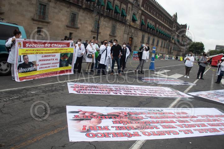 Con batas, caretas y portando cubrebocas, trabajadores de la salud se manifestaron para exigir la liberación del Doctor Gerardo Grajales Yuca, detenido en Chiapas por presunto "abuso de poder".