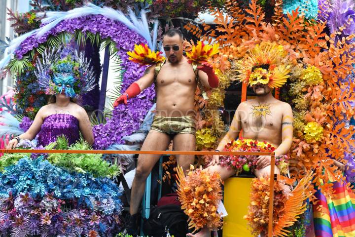 CIUDAD DE MÉXICO, 28JUNIO2025.- Tres personas desfilan arriba de un carro alegórico durante la edición 47 de la Marcha del Orgullo LGBTTTIQ+ que partió del Ángel de la Independencia rumbo al zócalo capitalino. FOTO: MARIO JASSO/CUARTOSCURO.COM