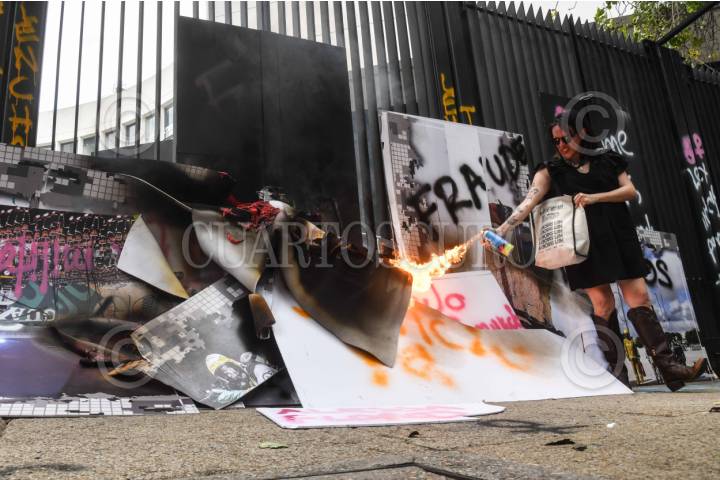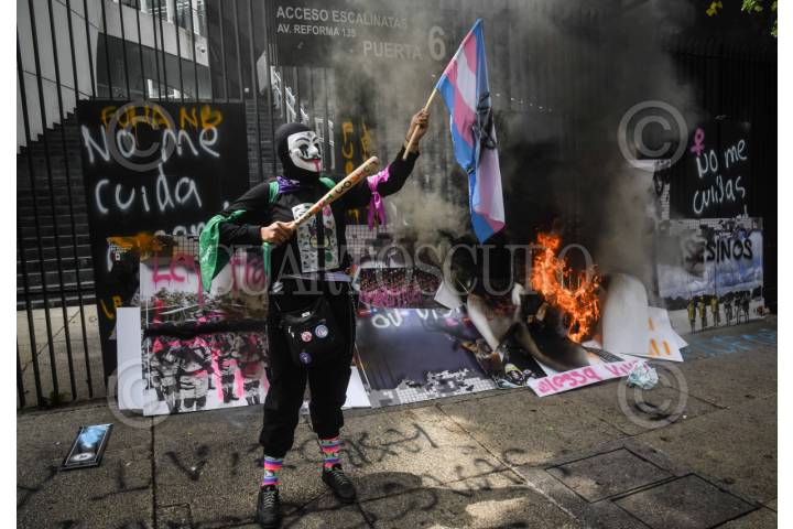 CIUDAD DE MÉXICO, 28JUNIO2025.- Un grupo de activistas de la comunidad transgénero retiró y quemó fotografías de una exposición de la Secretaría de la Defensa Nacional (SEDENA) que se encontraba al exterior de la Cámara de Senadores, en exigencia a la legislación que reconozca sus derechos. Dicha protesta ocurrió mientras se desarrollaba la 47 de la Marcha del Orgullo LGBTTTIQ+ que partió del Ángel de la Independencia rumbo al zócalo capitalino. FOTO: MARIO JASSO/CUARTOSCURO.COM