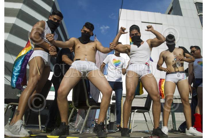 Miembros de la Comunidad LGBT en Monterrey despliegan la bandera del orgullo gay durante la Vigésima marcha de la Diversidad por el centro de Monterrey.