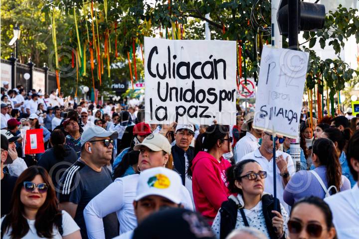 CULIACÀN, SINALOA, 09SEPTIEMBRE2025.- El 9 de Septiembre se cumple un año del estallido de violencia entre facciones del crimen organizado en Sinaloa por lo que miles de ciudadanos marcharon por las calles de Culiacán para exigir paz y justicia. La movilización partió desde la Parroquia Nuestra Señora de Guadalupe, conocida como La Lomita, y culminó en la Catedral Basílica del Rosario. Vestidos de blanco y portando banderas de México y de la paz, los manifestantes entre ellos empresarios, colectivos civiles, grupos de búsqueda, agricultores y familias alzaron la voz con mensajes como “El narco no manda, Sinaloa es nuestro” y “Ya basta, exigimos paz”, en una jornada marcada por el hartazgo social y la exigencia de un nuevo rumbo para la ciudad. FOTO: JOSÉ BETANZOS ZÁRATE/CUARTOSCURO.COM