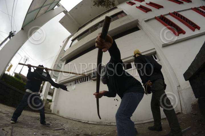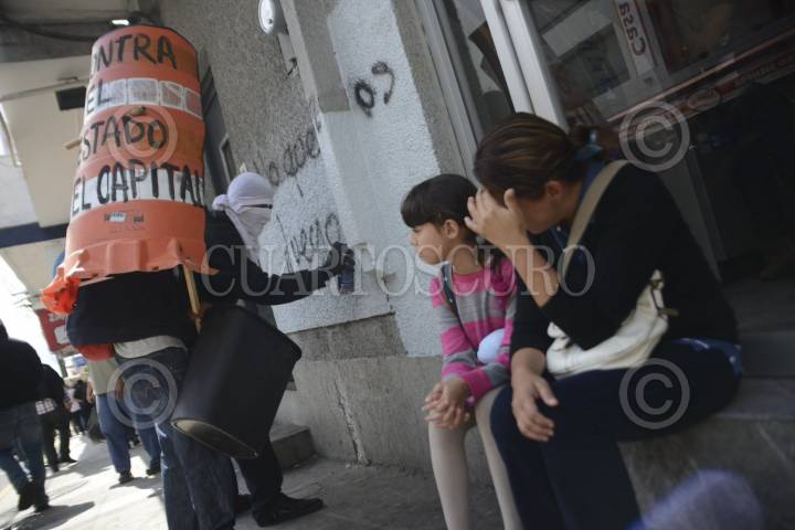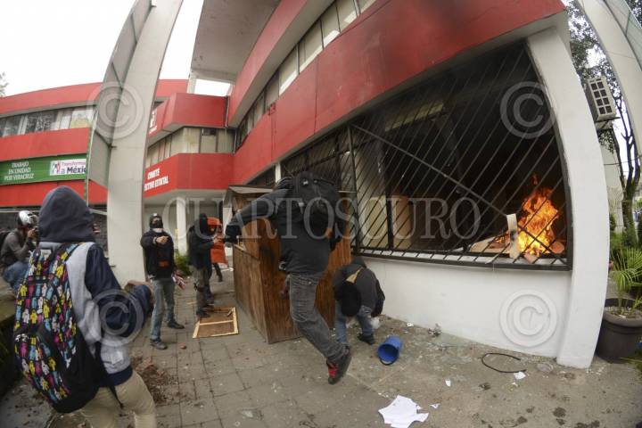 XALAPA, VERACRUZ, 15NOVIEMBRE14.- Estudiantes de la UV y maestros del Movimiento Magisterial Popular Veracruzano (MMPV), marcharon de la Benemérita Escuela Normal Veracruzana hacia el centro de la ciudad por los 43 normalistas desaparecidos en Ayotzinapa. Al contingente se unió un numeroso grupo de anarquistas quienes portaban escudos, palos, piedras y aerosoles con los que pintaron edificios gubernamentales, bancos, el edificio de la Fuerza Civil y el CDE de PRI que además fue apedreado y causaron un conato de incendio en una de las oficinas del inmueble. También derribaron el busto del priísta Jesús Reyes Heroles, que quedó tirado a media calle. FOTO: RUBÉN ESPINOSA /CUARTOSCURO.COM