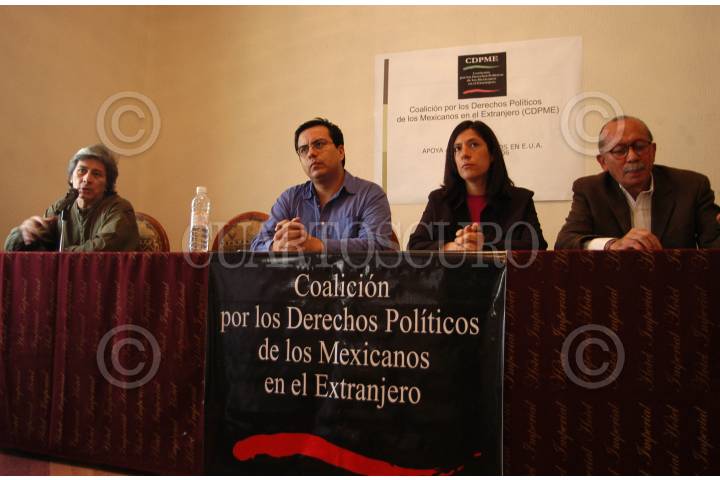 MEXICO D.F. 19ABRIL2006.- Carlos Rojas, Leticia Calderón, Primitivo Oceguera integrantes de la Coalición por los Derechos Politicos de los Mexicanos en el Extranjero ofrecieron una conferencia de prensa sobre el llamado a los contigentes obreros que marcharán el primero de mayo en los Estados Unidos. FOTO: Germán Romero/CUARTOSCURO.COM