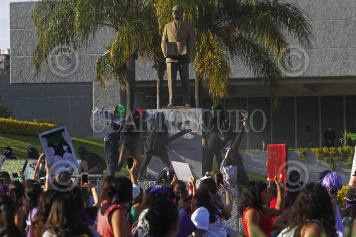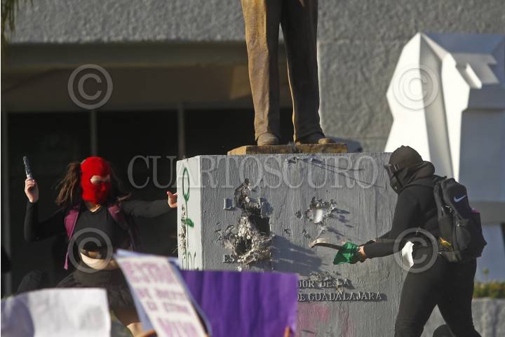 Integrantes de los colectivos radicales, bandalizan algunos estatuas de la Universidad de Guadalajara.