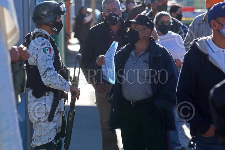 Adultos Mayores del Municipio de Etzatlán, Jalisco, hacen fila a las afueras del Centro de Salud del poblado para recibir la vacuna de AstraZeneca contra el Covid-19.