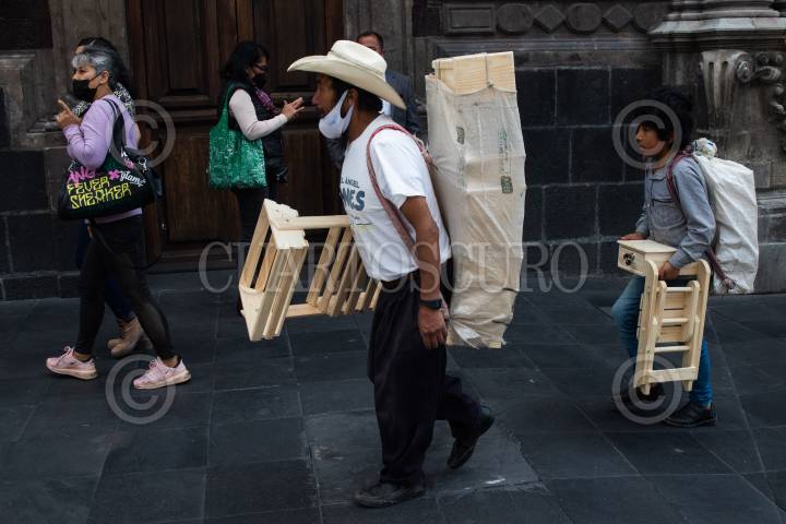 Padre e hijo inician su jornada laboral vendiendo muebles de madera en la calles del Centro Histórico.