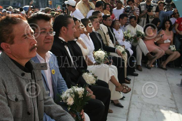 MÉXICO, D.F., 14MARZO2010.- Nueve parejas lesbico-gay, contrajeron nupcias al termino de la marcha que partió del Ángel de la Independencia y culmino en el Hemiciclo a Juárez. En la ciudad, es la primer boda colectiva de este tipo después de entrar en bigor la ley que aprueba los matrimonios entre las personas del mismo sexo. FOTO: ENRIQUE ORDÓÑEZ/CUARTOSCURO.COM