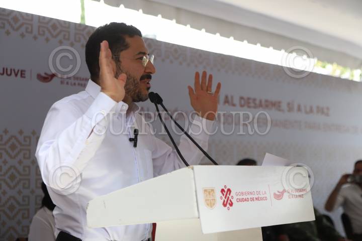 Martí Batres, Secretario de gobierno de la Ciudad de México durante la apertura del módulo “Si al desarme, si a La Paz” en la Iglesia de San Hipólito, a la cual asistió parte del elenco de la obra de teatro “Busco al hombre de mi vida, marido ya tuve”.