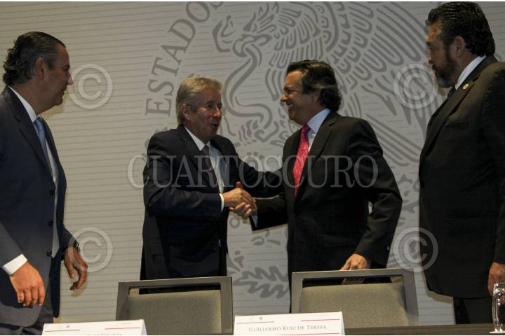 CIUDAD DE MÉXICO, 24OCTUBRE2016.- Gerardo Ruíz Esparza, secretario de Comunicaciones y Transportes, saludó a Guillermo Ruíz de Teresa, coordinador general de Puertos y Marina Mercante, durante la inauguración de la Reunión Nacional de Puertos de la Marina Mercante. El secretario destacó el importante labor de este sector en materia de comunicaciones así como su compromiso por la construcción de las obras designadas en el sección del Presidente Enrique Peña Nieto. FOTO: GALO CAÑAS /CUARTOSCURO.COM