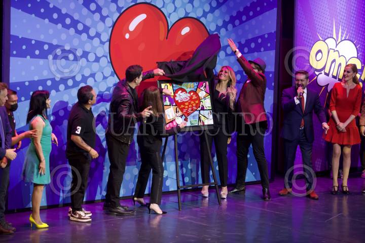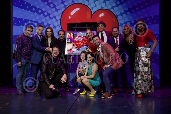 Elenco y padrinos durante la develación de placa por las 100 representaciones de la puesta en escena Te amo eres perfect@ …ahora cambia! Que se presenta en el Teatro Hidalgo.