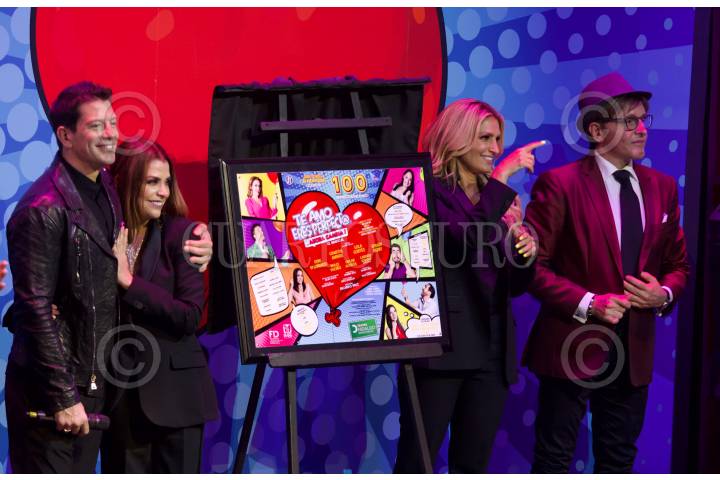 Yahir, Lisset, Annette Cuburu y Mario Iván Martínez durante la develación de placa por las 100 representaciones de la puesta en escena Te amo eres perfect@ …ahora cambia! Que se presenta en el Teatro Hidalgo.
