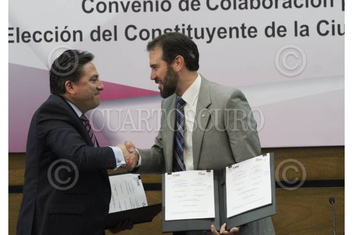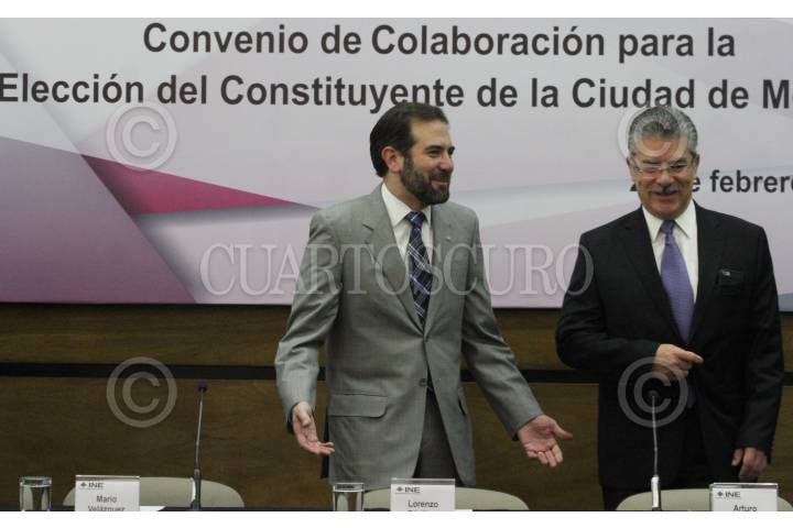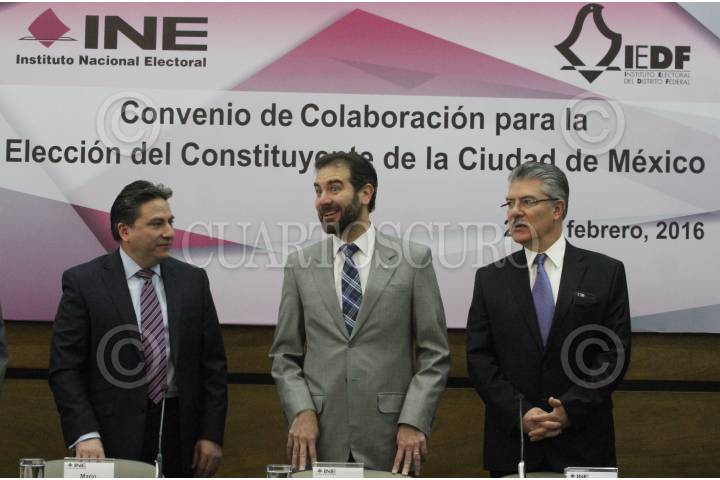 CIUDAD DE MÉXICO, 26FEBRERO2016.- Lorenzo Córdova, consejero presidente del Instituto Nacional Electoral (INE), y Mario Vázquez Miranda, consejero presidente del Instituto Electoral del Distrito Federal (IEDF), firmaron un convenio de colaboración entre ambas instituciones cuyo objetivo será incrementar la coordinación para la Elección del Constituyente de la Ciudad de México. La cuenta regresiva comenzó y restan cien días para los comicios. FOTO: MARÍA JOSÉ MARTÍNEZ /CUARTOSCURO.COM