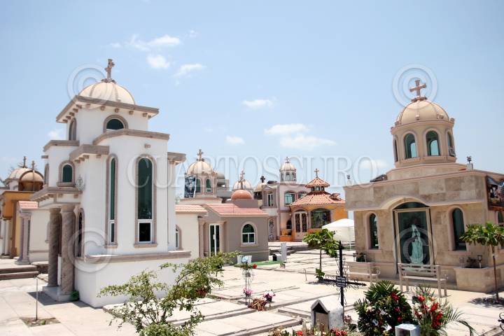 CULIACAN, SINALOA,. 02JUNIO2008.- Algunos panteones en Sinaloa cuentan con grandes lujos. Las tumbas son, amplias, ostentosas, elaboradas de cantera, marmol y con acabados finos, parecidos a las iglesias de las diferentes localidades, dichos cementerios alcanzan precios equivalentes a una casa habitacion en zonas urbanas. Las cervezas, botellas de licor, fotos, sombreros, cigarros, mantas, santos, medallas y rosarios de oro, decoran las criptas. El la imagen el panteón Jardines del Humaya en Culiacan. FOTO: SAUL LOPEZ/CUARTOSCURO.COM