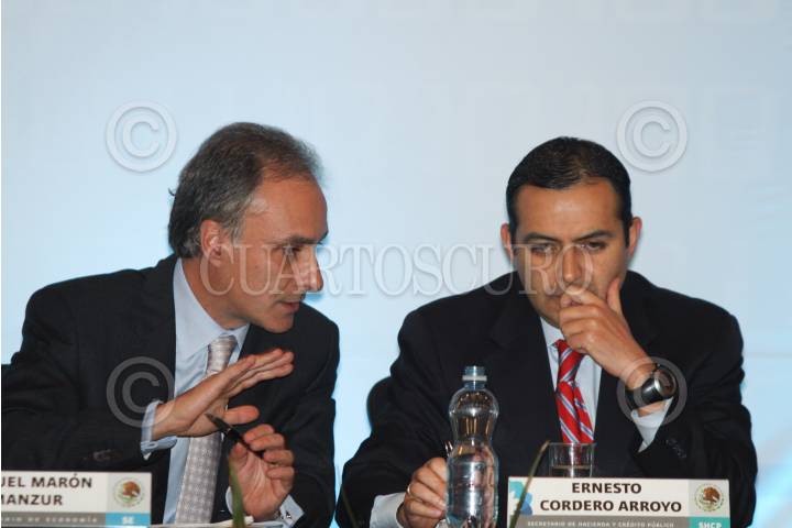 MÉXICO, D.F., 11AGOSTO2011.- Miguel Marón Manzur, subsecretario para la pequeña y mediana empresa, y Ernesto Cordero, secretario de Hacienda y Crédito Público, durante la presentación de las "Estrategias de Financiamiento del gobierno federal a PYMES", en el salón Tesorería del Palacio Nacional. FOTO: MOISÉS PABLO/CUARTOSCURO.COM