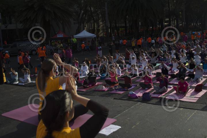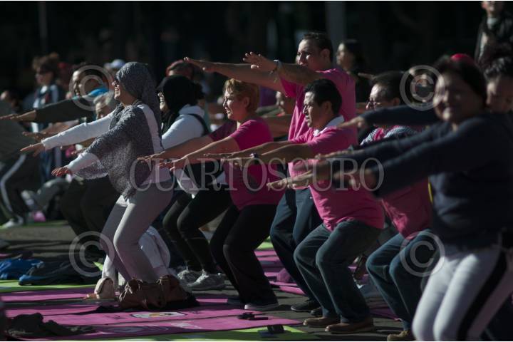 MÉXICO, D.F., 04ENERO2015.- Ciudadanos y turistas se congregaron este día en la Glorieta de la Diana Cazadora para asistir a la primera sesión de la Clase de Yoga Masiva, que el Gobierno de la Ciudad de México, por medio del Instituto del Deporte dirigió para comenzar el año nuevo con ejercicios que bajan el estrés, mejoran la condición física y mantienen un buen estado de ánimo. FOTO: IVÁN STEPHENS /CUARTOSCURO.COM
